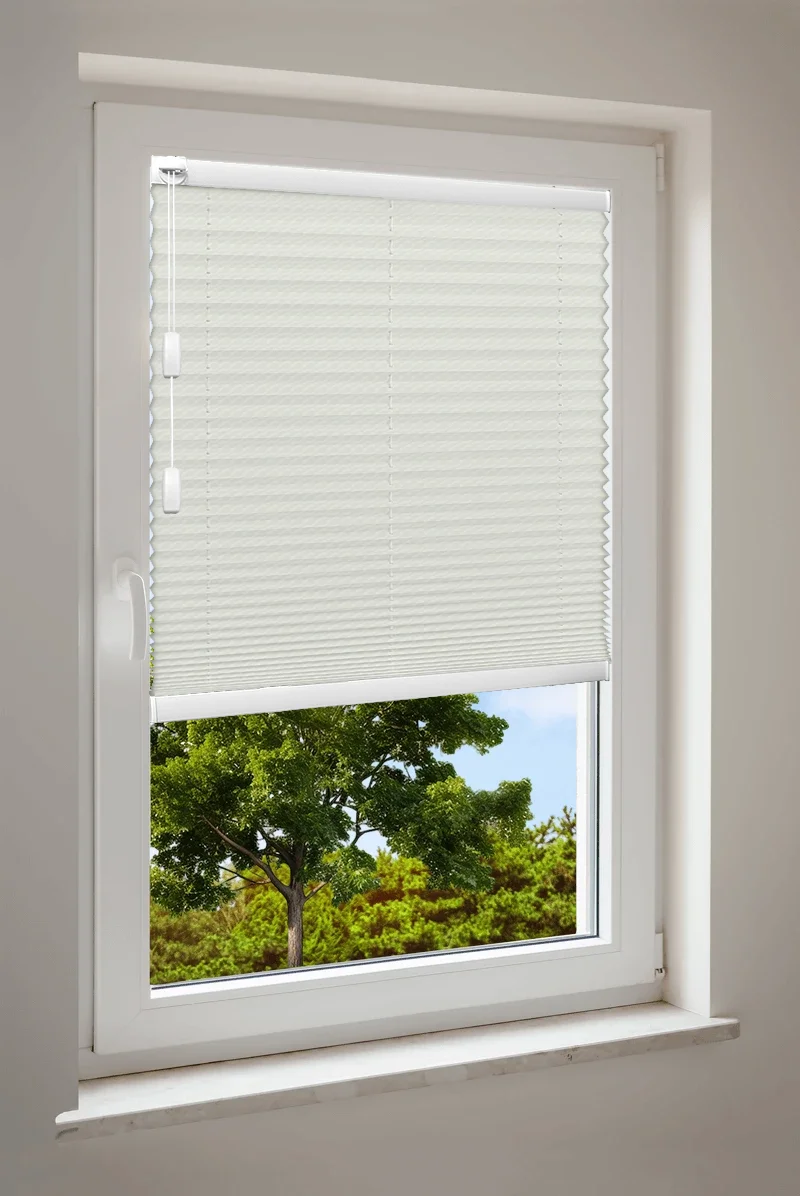 • Maßgefertigtes Cosiflor® F1 Plissee in eleganten cremefarbenen Stoffvarianten – ideal für eine warme und stilvolle Raumgestaltung