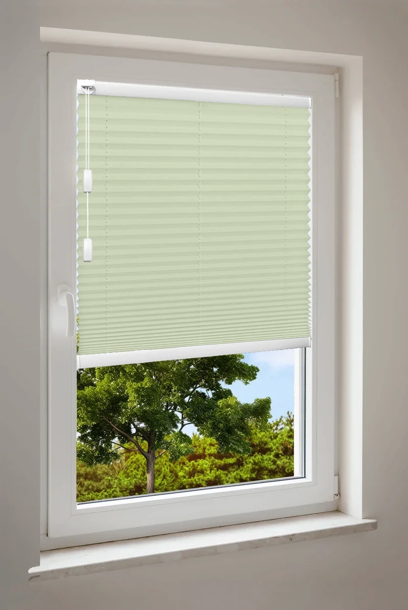 • Maßgefertigtes Cosiflor® F1 Plissee in stilvollen grünen Stoffvarianten – ideal für eine natürliche und frische Raumgestaltung